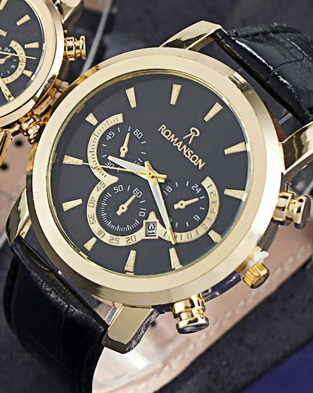 ست ساعت مچی رومانسون ROMANSON طرح سه موتوره مدل 1385 یک محصول با بند چرمی و ترکیب زیبای رنگ مشکی و طلایی است که در دستان هر فردی به زیبایی می درخشد